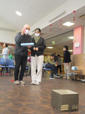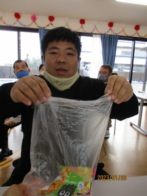 カラオケの後はビンゴゲームです。ビンゴになった順番でおやつの摑み取りをしました。