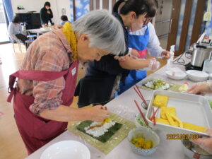 それと同時にけんちんの野菜切り、併せて、デザートのクリームあんみつの白玉作りやフルーツカットもみんなで協力していきます。