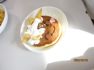 おやつはホットケーキを作り、そこに鬼の顔を描き👹、いただきま~す💛💛💛