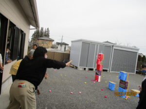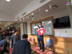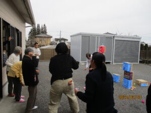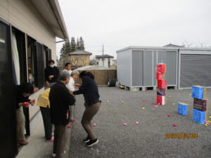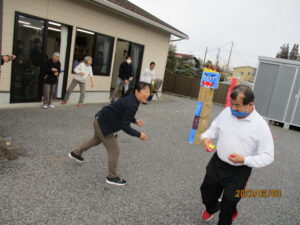 今年の鬼は、職員さん発案の下段ボールで作成。それに目掛けて豆をまく予定でしたが、率先して鬼の厄を担ってくれる方々が続々登場⁉