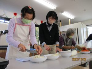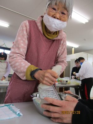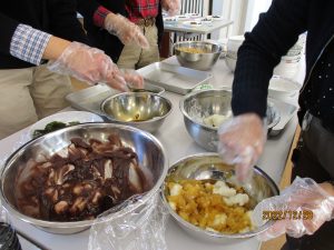 こんにゃくをちぎる人、大根をすり下す人、畑に白菜を取りに行く人。