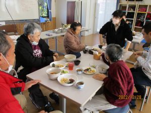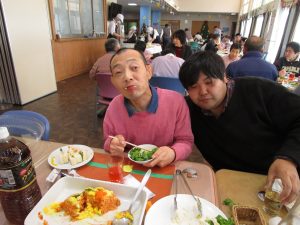 昼食は具だくさんのけんちん汁・大地ご用達のキャベツの塩もみ。
