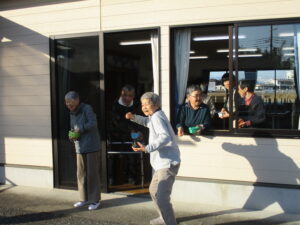 オニは外~ 女子チームが豆をもって待ち構えていました💦