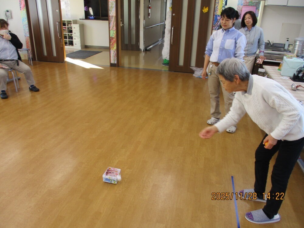 続いては「お手玉入れ」。お手玉を籠に入れる人とそれを阻止する人に分かれてチャレンジです。