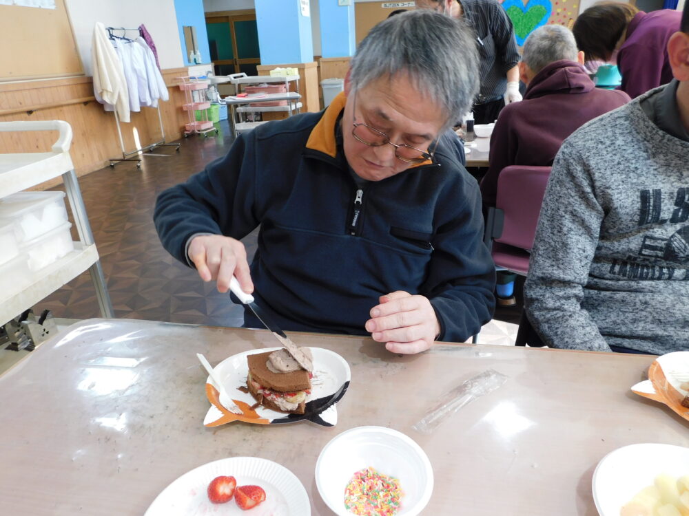 スポンジにチョコクリームを塗ったり 大好きなフルーツをトッピング みんな真剣です💦