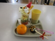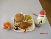 利用者さんからのリクエストでハンバーガーとシチュー、デザートにトナカイのチョコパイ・サンタのモンブランパフェを作りました。